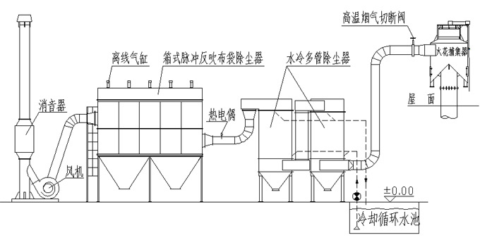 沖天爐的除塵有別于其他設(shè)備的除塵,沖天爐的煙氣溫度,低的時候100℃都不到,高的時候700—800℃,甚至近千度,這就要求除塵系統(tǒng)必須具備廣泛的適應(yīng)能力,因此必須配備強有力的煙氣冷卻設(shè)備。我公司根據(jù)沖天爐大小配備合適的兩臺水冷多管除塵器,其冷卻面積達到400—500m2,能確保高溫煙氣經(jīng)水冷多管除塵器冷卻后,煙氣溫度在布袋的可承受范圍內(nèi)(低于100℃)。且經(jīng)過水冷多管除塵器,能將顆粒大的,有燃燒可能的焦炭粒沉降下來,更保護布袋的安全。
