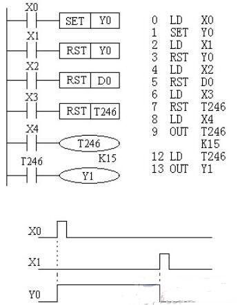 1)當 X0 常開接通時, Y0 變為 ON 狀態并一直保持該狀態,即使 X0 斷開 Y0 的 ON 狀態仍維持不變;