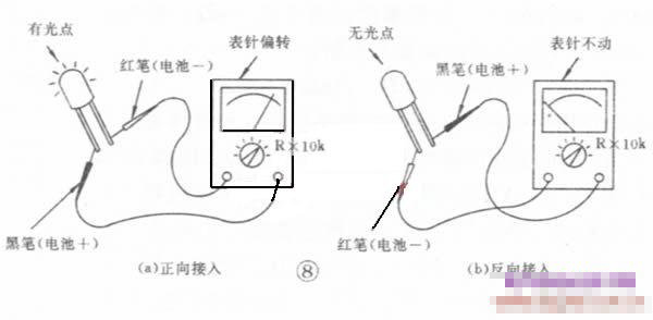 測試發光二極管的好壞,可以按照測試普通硅二極管正反向電阻的方法測試。指鐘式萬用表撥在R*100或R*1K檔,用黑表筆接發光二極管正極,紅表筆接負極,測得正向電阻應在20=40K;用黑表筆接發光二極管負極,紅表筆接正極,測得反向電阻應大于500K以上。用數字式萬用表撥在二極管檔,黑表筆接發光二極管正極,紅表筆接負極,阻值為無窮大。黑表筆接發光二極管負極,紅表筆接正極,發光二極管會有微亮,表示正常。測式方法如圖