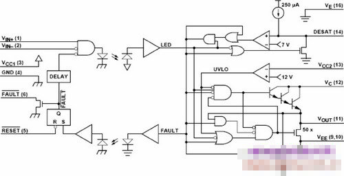 在剛剛上電的過程中,芯片供電電壓由0V逐漸上升到最大值。如果此時芯片有輸出會造成IGBT門極電壓過低,那么它會工作在線性放大區。HCPL316J芯片的欠壓鎖定保護的功能(UVLO)可以解決此問題。當VCC與VE之間的電壓值小于12V時,輸出低電平,以防止IGBT工作在線性工作區造成發熱過多進而燒毀。示意圖詳見圖1中含UVLO部分。