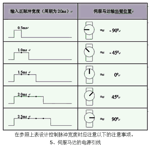 隔離(因為伺服馬達會產(chǎn)生噪音)。甚至小伺服馬達在重負載時也會拉低放大器的電壓,所以整 個系統(tǒng)的電源供應的比例必須合理。 輸入一個周期性的正向脈沖信號,這個周期性脈沖信號的高電平時間通常在1ms—2ms之間,而低電平時間應在5ms到20ms之間,并不很嚴格,下表表示出一個典型的20ms周期性脈沖 的正脈沖寬度與微型伺服馬達的輸出臂位置的關系: 在參照上表設計控制脈沖寬度時應注意以下的注意事項。