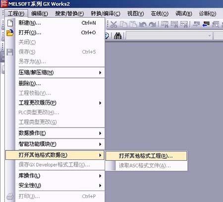 1 步:在 GX Works2 中,點工程、打開其他格式數據打開其他格式工程;