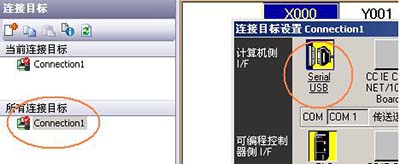 編程電纜插傳統的圓孔時,連接目標設置選擇 RS-232C,并且要選擇相應的 COM 編程電纜插迷你 USB 時,連接目標設置選擇 USB。