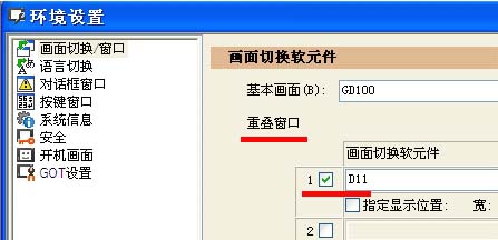 在環(huán)境設(shè)置對話框中,重疊窗口這一欄選中第 1 個復(fù)選框,然后在畫面切換軟元件中輸入一個字元件。其它地方不做修改,點擊確定。