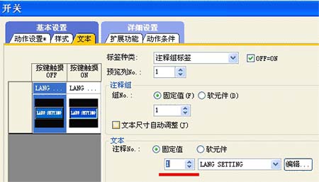 我們在窗口畫面中加入兩個開關(guān)做語言切換和一個返回開關(guān)。開關(guān)的建立和第一個開關(guān)建立相似,標簽種類都為注釋組標簽,動作都設(shè)為點動。軟元件名分別為 M10、M11、M12。文本注釋 NO 的固定值分別為 2、3、4。