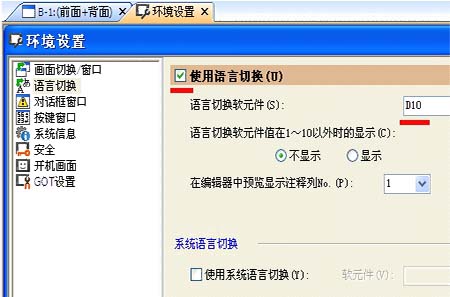 按下 M10 或初始化默認,給 D10 傳送值 1,使其顯示所設(shè)定一種語言。按下 M11,給 D10 傳送值 2,使其顯示另一種語言。