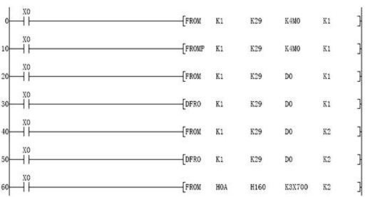 0行:當(dāng)X0=1時,讀取1號(第1個K1)三菱PLC模塊緩沖區(qū)地址29(K29)的數(shù)據(jù)保存到M0~M15的16點(K4)中間繼電器中。