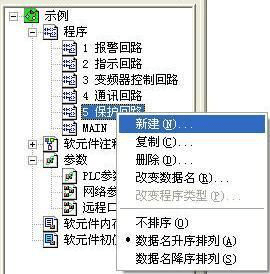首先只要隨便右鍵單擊其中的任一項目,在彈出的窗口中選擇“新建”,然后在彈出的“新建”窗口中再選擇三菱PLC程序類型,數(shù)據(jù)名和索引就可以了建立分類程序的方法很簡單如下圖所示: