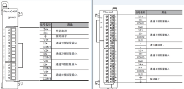 區別四:最大絕對輸入量不同,FX3U-4AD的電壓最大絕對輸入為±15V ,電流最大絕對輸入為+30mA; FX3U-4AD-ADP的電壓最大絕對輸入為-0.5V、+15V,電流最大絕對輸入為-2mA、+30mA。