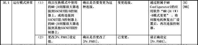 首先,可以確定的是,三菱伺服電機MR-J4系列報警“3E.1”是運行模式異常的故障,與三菱伺服電機本身并無半毛錢的關系,具體三菱伺服報警說明如下圖所示: