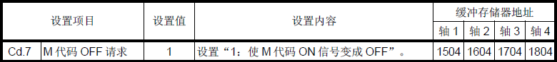 當(dāng)M代碼ON 信號(hào)(X4、X5X6、X7)為ON 時(shí),必須通過(guò)順控程序使它變成OFF。為了使M代碼ON 信號(hào)變成OFF,在Cd.7 M 代碼OFF 請(qǐng)求”中設(shè)置“1”。