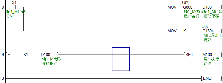 下面是一個(gè)把Md.25 有效M代碼”讀入PLC CPU 數(shù)據(jù)寄存器(D110)的順