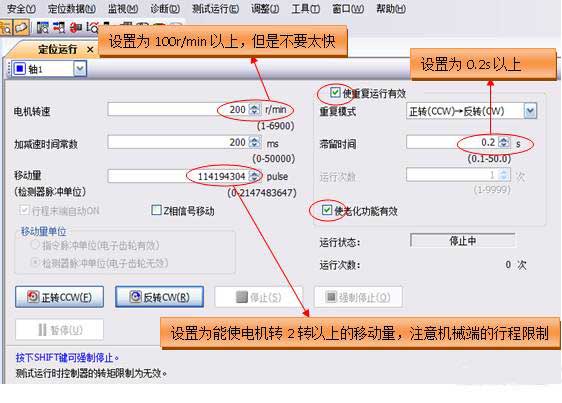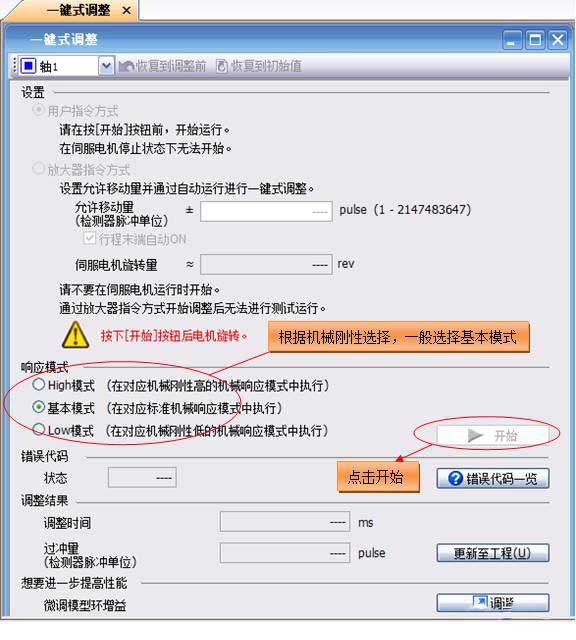 一鍵式調整需要在伺服電機運行中進行調整,因此,在進行調整期間,需要使伺服電機進行正反轉反復運行。可以先使用“測試運行”功能使伺服電機進行定位運行。