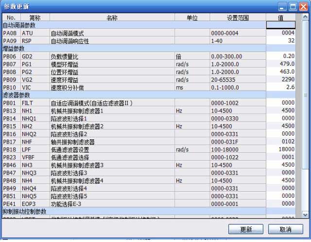 窗口中的三菱伺服參數即是伺服一鍵式調整時自動調整的參數。