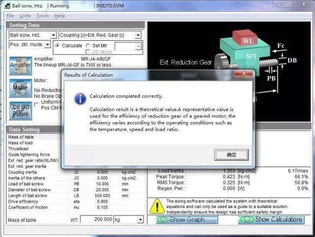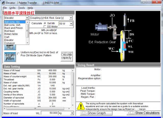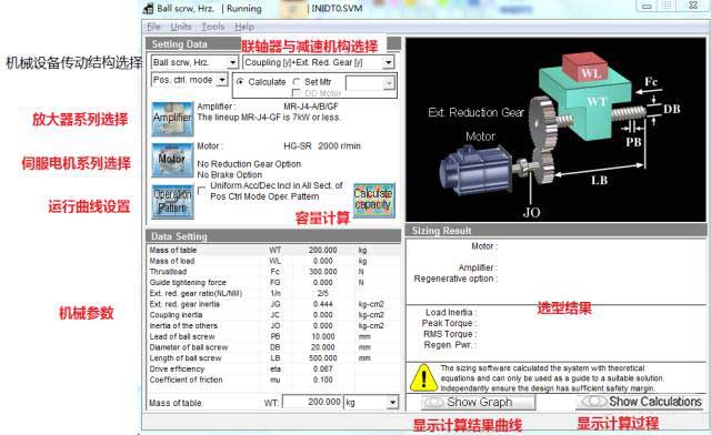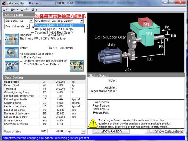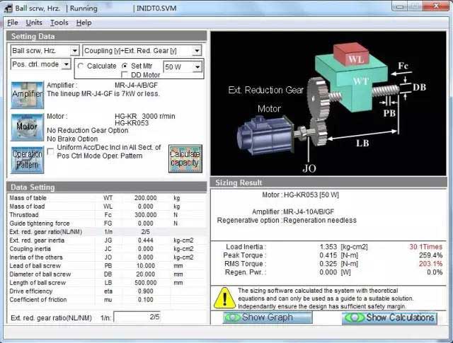 若計算出錯,或者所選伺服放大器/電機(jī)無法匹配,會出現(xiàn)以下畫面,在選型結(jié)果處顯示相關(guān)信息,不符合要求的參數(shù)紅字表示。
