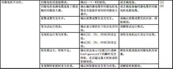 (下表對應(yīng)MR-JE系列伺服放大器,更多伺服放大器故障排查方法請參考相應(yīng)的伺服放大器技術(shù)資料集(故障排除篇))