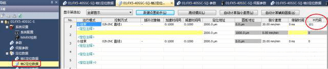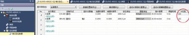 其次,在定位數據的最后一列,就是設置M代碼的地方,每一個定位數據都可以設置一個M代碼,M代碼可以在1-65535中任意設置一個整數(設為0則表示不使用),同一軸的定位數據里,M代碼不要設為一樣,不同軸之間則無所謂比如,在本例中,軸1定位數據1M代碼設置為100,定位數據2M代碼設置為102。 為了在程序中不混淆,軸2定位數據1M代碼設置為101
