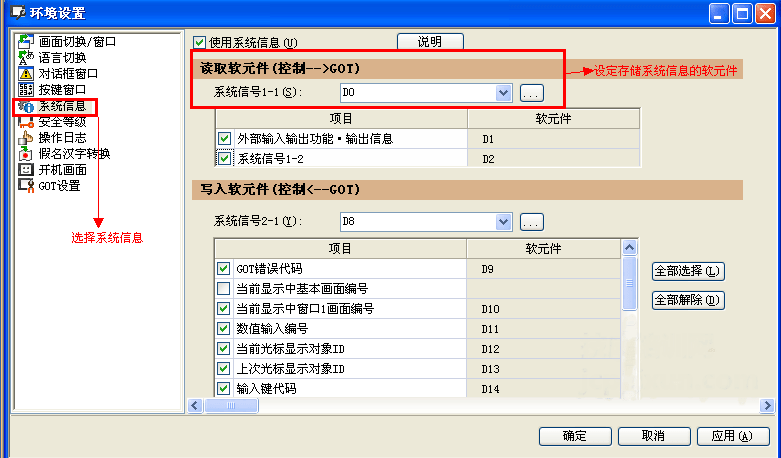 點擊菜單欄中的“公共設置”中的“GOT環(huán)境設置”選擇里面的系統(tǒng)信息,打開系統(tǒng)信息對話框,如圖所示: