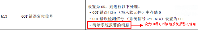 系統(tǒng)信號1-1中每一位都有其相應的意思,詳情請參看三菱觸摸屏手冊公共篇中系統(tǒng)信息內(nèi)容說明中的介紹,在這里面我們需要清除這些報警信息,必須把D0中的b13位置為ON,b13位的作用如下圖所示。