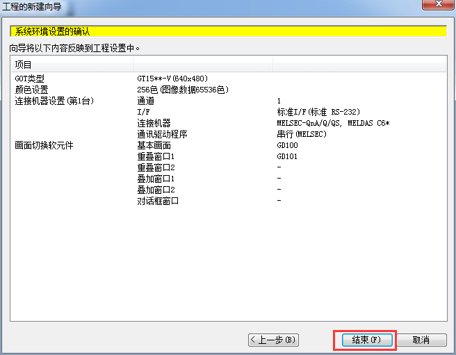 2.1.9 系統環境設置確認,單擊[結束],到此完成一個工程項目新建。