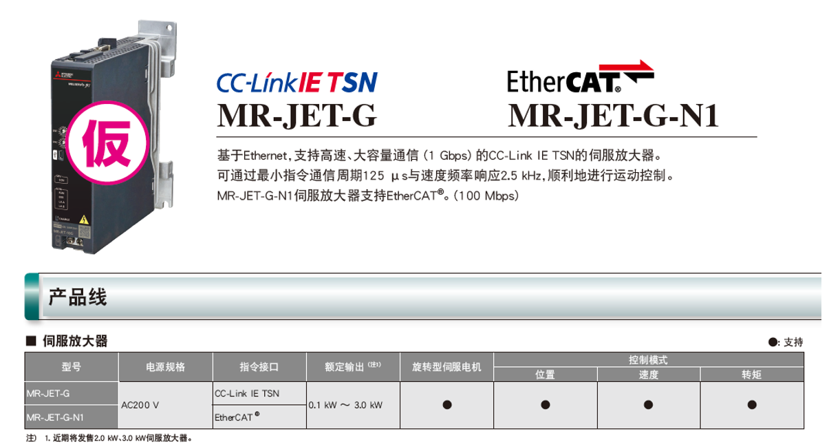 基于Ethernet,支持高速、大容量通信(1 Gbps)的CC-Link TSN的伺服放大器。可通過最小指令通信周期125us 與速度率響應2.5kHz,順利地進行運動控制。MR-JET-G-N1伺服放大器支持EtherCAT?。(100Mbps)