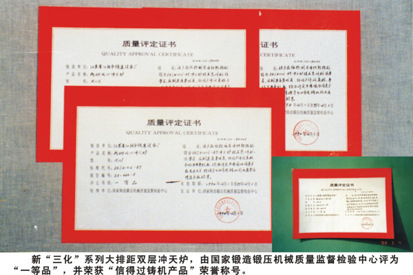 “新三化”系列R11型大排距雙層送風(fēng)沖天爐,為原機(jī)械部一項重大科技成果,從“八?五”規(guī)劃以來一直被列為國家重點科技成果推廣項目,我公司為重點推廣項目定點生產(chǎn)單位。